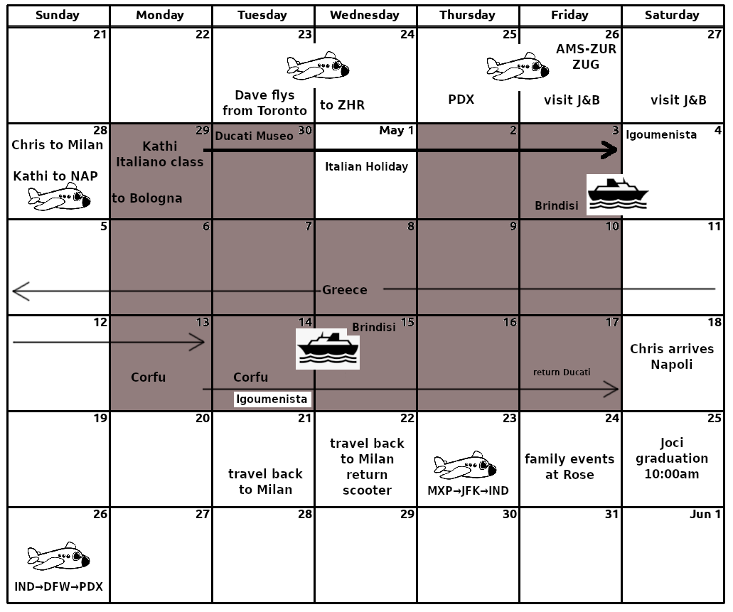 -  Fri May 17  Kathi class;     Chris explore southern Italy 4, end in Naples --- Dave departs ZRH 1:15pm